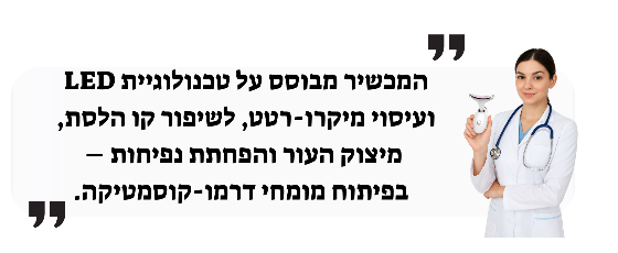 העור שלך הופך לחלק, זוהר וגוון אחיד יותר – האור הירוק עוזר למזער כתמים כהים ולהשיב לעור שלווה ואחידות טבעית.